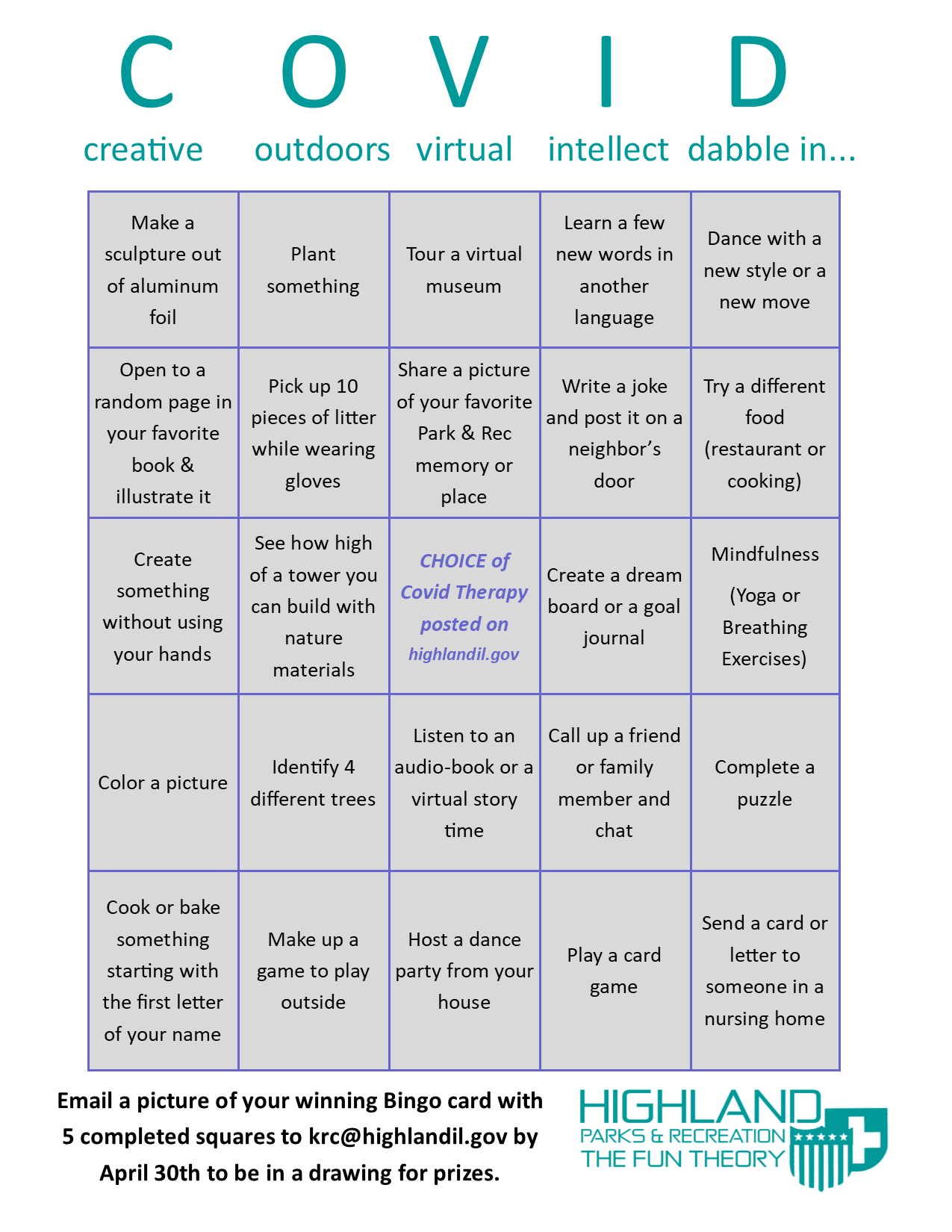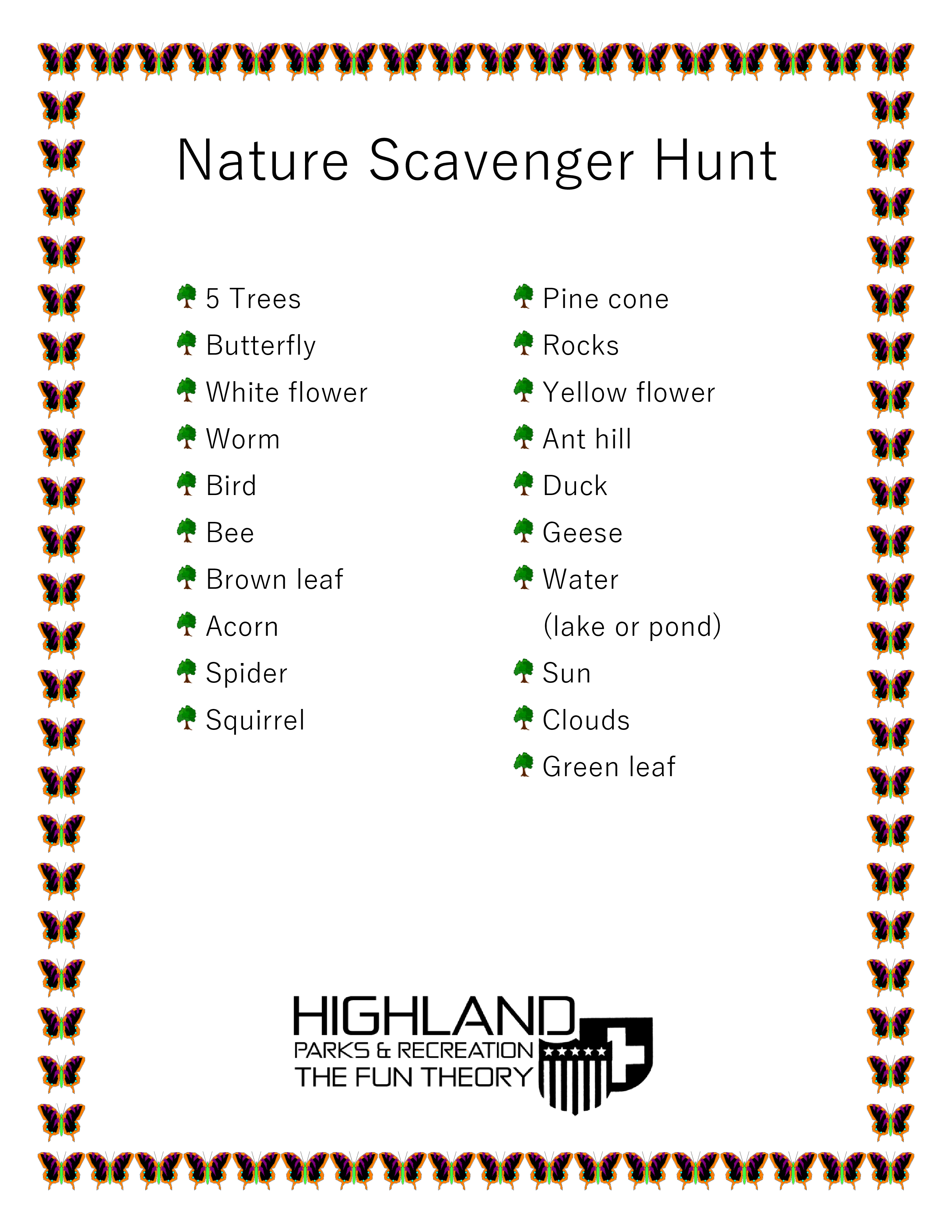 Please enjoy these activities either at home or while out enjoying some fresh air. If comfortable sharing, please post publicly with #highlandfuntheory.